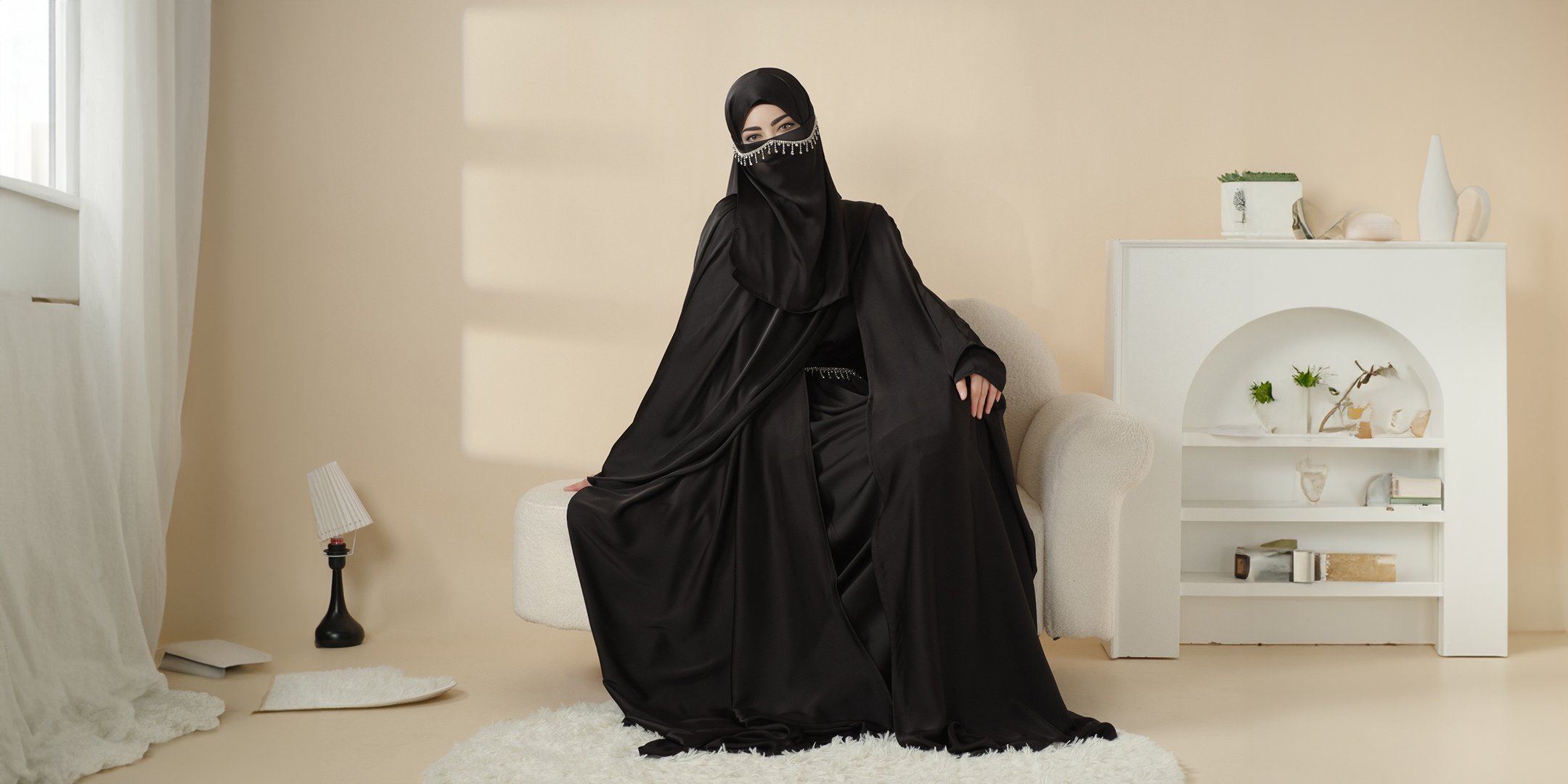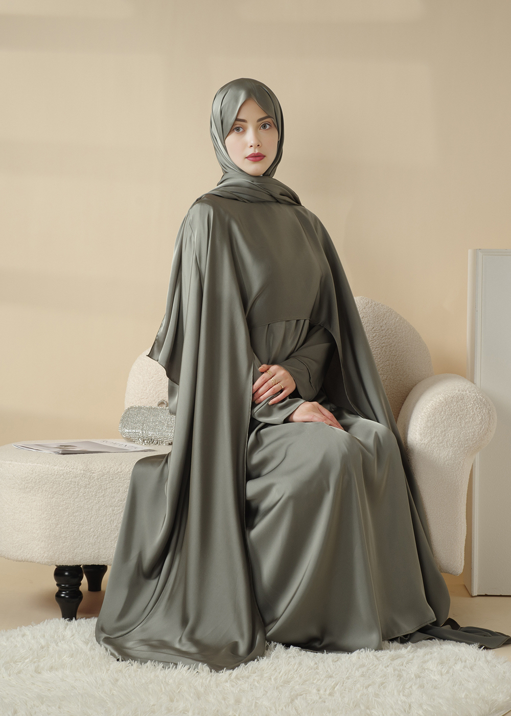 طقم عباية ستان فضفاض بغطاء كامل مكون من 5 قطع مع نقاب